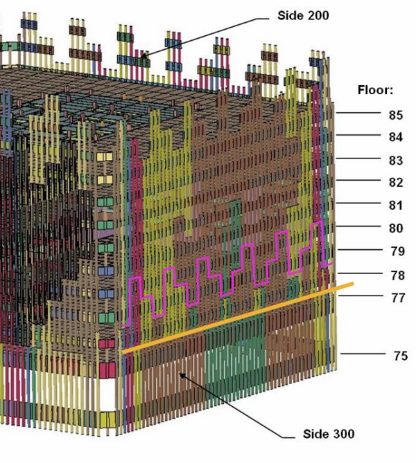In order to understand an important detail of the collapse of each tower, especially WTC2, it is necessary to identify the lowest bolted column-to-column connections along each perimeter just above the MER levels. This is how it is done: