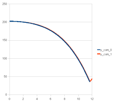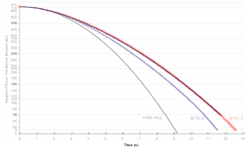 If I make the joints of the lower block quite weak, but still well above non-existent, and the upper joints really strong to ensure crush down, I get a time of about 10.7 seconds - with a stretch of 0.2. With a stretch of 0.02, it's about 11.7 seconds. After a slight vertical offset to account for our different starting heights, it lays right on top of Dr. Greening's WTC1 curve.
