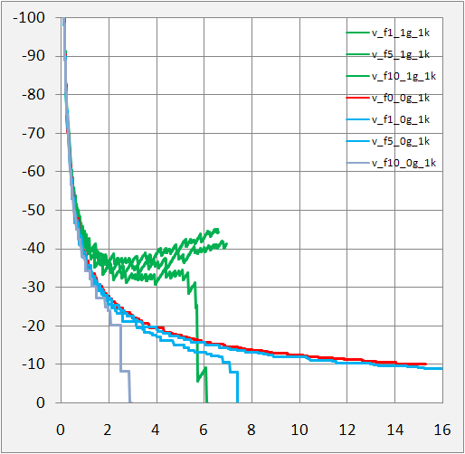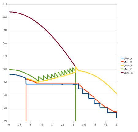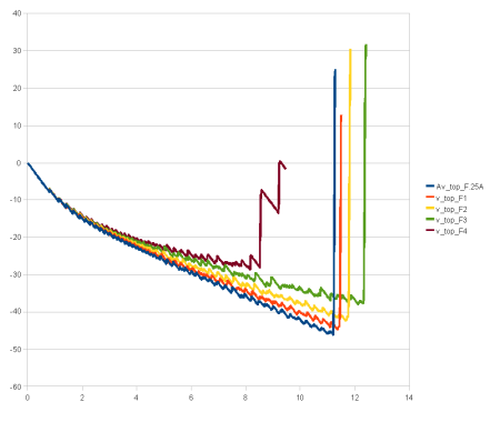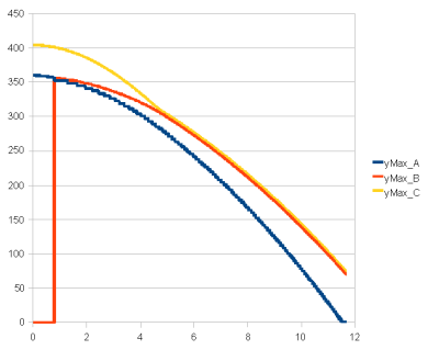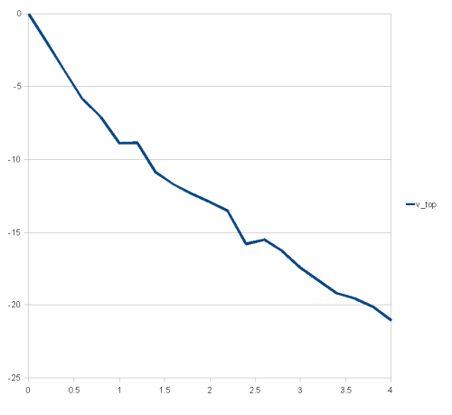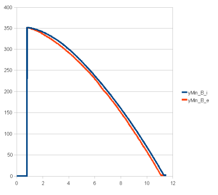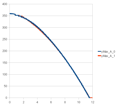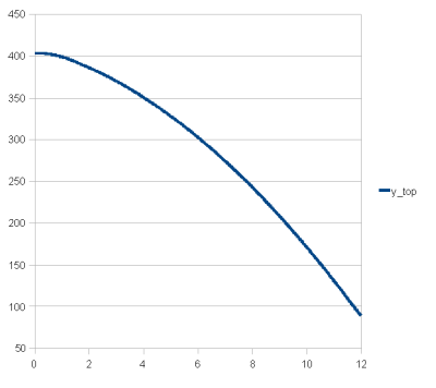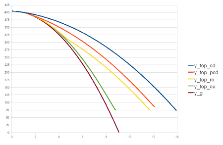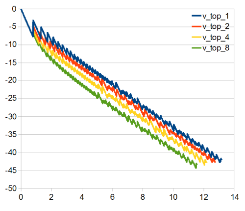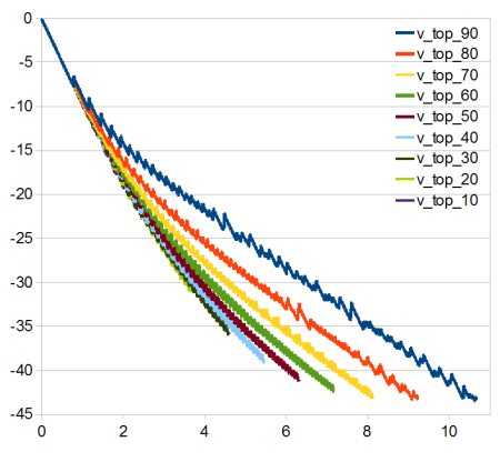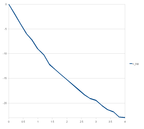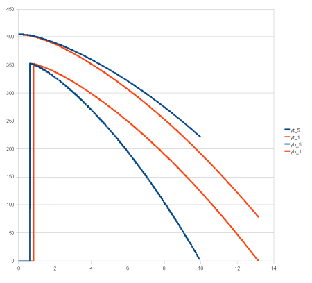 If you compare to the graphs posted in the referenced War Wheel thread, the immediate obvious difference is that this scheme does not result in the final velocities ending up the same in each case, the heavier ones are faster - all falling the same distance. Otherwise, there's not much discernable difference amongst any of the different schemes, shape-wise.