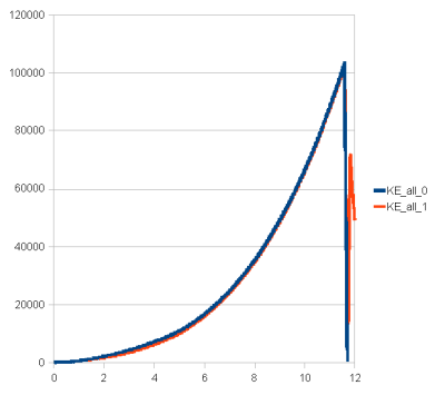 The previous graph compares KE in the time domain, but that's not an entirely fair comparison since the high speed collapse crushes much more structure per unit time. These two graphs compare the KE of the high speed and normal collapse against position. Still, not too revealing but this time we see the KE is actually comparable by the collapse position.