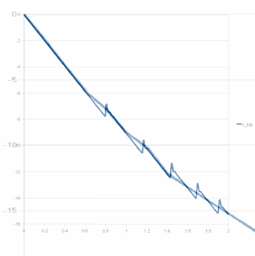 The jagged blue line headed south is the physics engine model arresting a 1000 m/s single slab impactor six seconds into crush. The arresting model had only an equivalent average resistive force of less than 0.25m(t)g from supports; the same in the stepwise computation begins accelerating again during this time. The difference is that the debris zone in the phyics simulation is free to wiggle about up and down, though the slabs are inelastic (zero restitution) they still slap about a little and approximate 'loose(r) debris' if only in a 1D sense. This is in contrast to the fusing which occurs by definition in the stepwise model - the debris zone as well as the upper block is rigid. This turns out to matter more in some cases than the rigidity of the upper block.