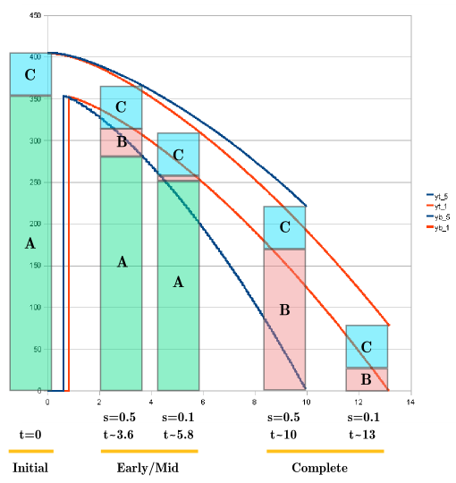 The stepwise calculator is in work, but usable. There were small disagreements between it and the physics simulation, primarily stemming from ill-defined story counts in the zones. I was forced to think about this problem and resolve it in order to calibrate against the analytical model. For example, a crush down involving a rigid upper block of 1 story leaves the top story intact at the end. Since one story is as small as the upper block can be, it means a collapse can never be complete under this scheme if exclusively crushdown. The top story can crush up (but as Bazant notes, even this cannot fully complete the crushing of the story!) but an exclusive crushdown leaves a minimum of one story behind, an intellectually untidy affair to me but one that was never a concern until trying to relate results to the slab model in the physics engine. Since the physics sim starts with slabs already 'compressed' and just lets them collide, a single story upper block is already compacted and the final pile height from the y_top coordinate is different.