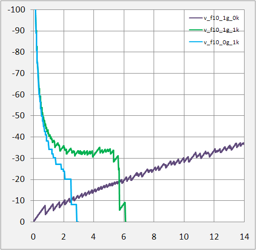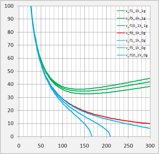 The previous three cases will be examined in greater detail shortly. In the meantime, here is a similar pair of graphs for the same configurations done in the stepwise calculator. The big difference is that these are in the spatial domain; that is, plots of velocity versus position instead of versus time, because the step increment is spatial in the stepwise calculation. Kind of an interesting twist. The two zero g cases of FOS 5 and 10 arrest as in the physics sim, but none of the 1g runs arrest.