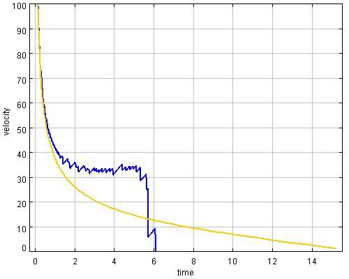 Comparing against an analytical result which arrests in the same time, the stepwise model had to have support capacities increased 3.7x. This has been added to the previous graph of stepwise results showing velocity versus displacement (the orange line):