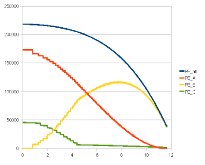 Potential energy distribution amongst the zones, against the total available, mostly reflects the changing distribution of mass of each zone, with everything going towards B and a gradually reducing amount because of descent: