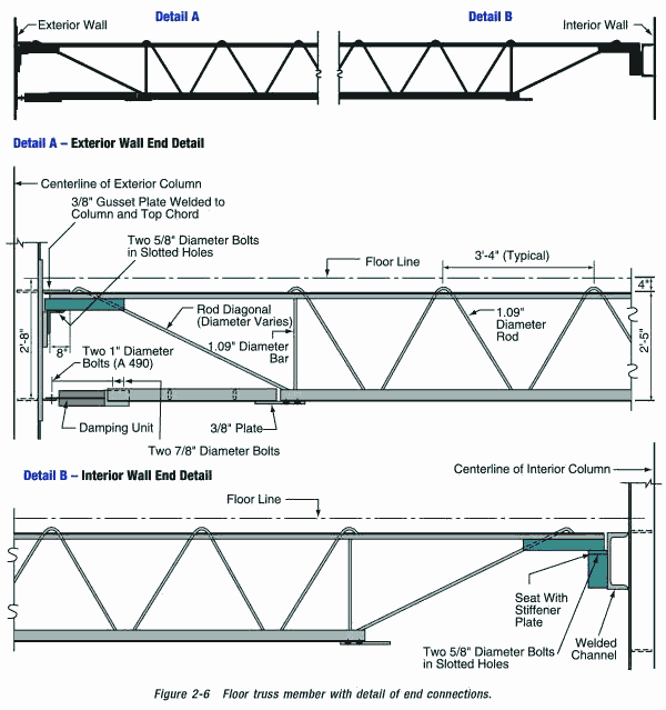 Fig 2.14 The OOS truss connections on the core side and the perimeter side from NIST NCSTAR Fig 2-6.