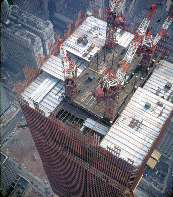 Fig 2.19 In the case of WTC1, the entire east-west width of the core survived the initial collapse. Animated gif version here