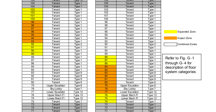 These MER regions would provide the most resistance to a progressive floor collapse within the OOS region between perimeter and core. In the case of WTC1 where tje collapse initiated within the 95-98th floor region, almost 20 floors of mostly type 1 progressive floor collapse could take place before the 75-77th floor MER level is reached.