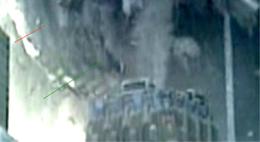 2) The pieces above the failure line fall outward and over the pieces under the failure line. They are quickly stripped from the building and go into free-fall The yellow rectangle is largest piece shown above. northeast corner is light blue, northwest corner darker blue.
