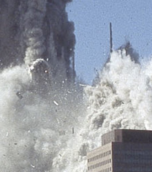 A very large piece of perimeter is hidden in just inside the dust about to emerge. The northeast corner has broken away from the building and gone into free-fall (left).