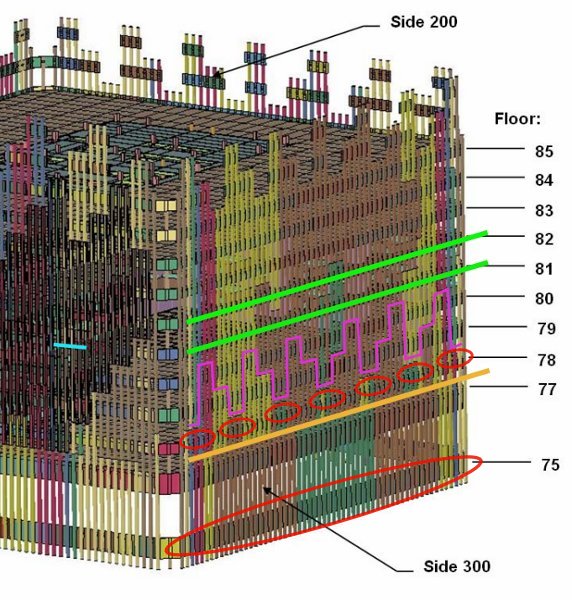 The 78th floor ejections originate from 7 locations marked by red ovals: