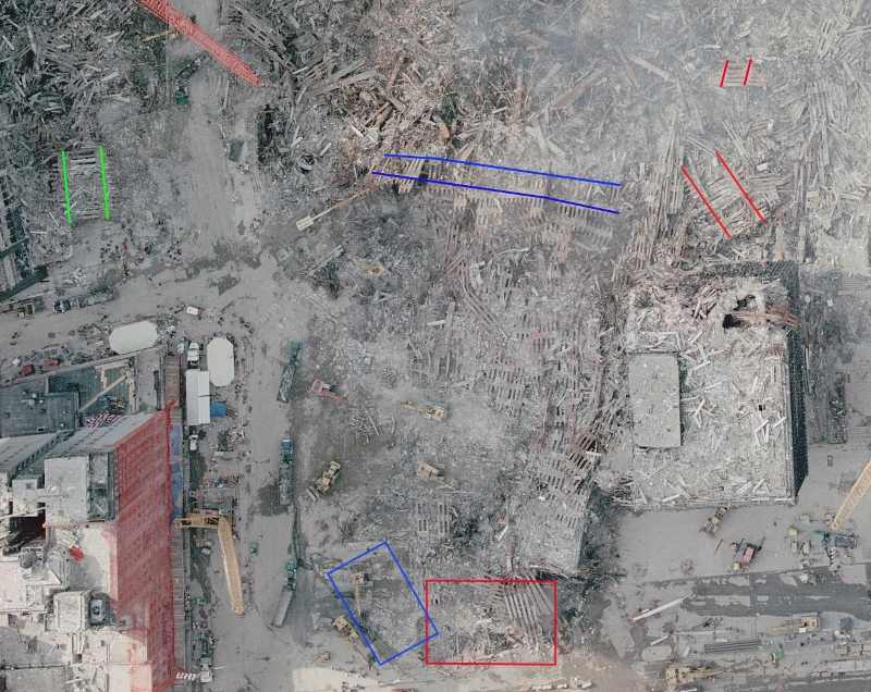 This is the debris as it looked just after 9-11-01. The large MER sections sit at the very end of what appears to be a large, rolled-out sheet of perimeter wall. It is, in fact, the entire east side of WTC2 from the 41-43 fl MER level downward., about 60 columns wide (57 to be exact, excluding the cornermost sections).
