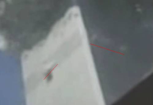 The extra-strong MER panel sections are distinctly leading the falling debris in images taken from the west during collapse. The red trajectory and the blue sheet of panels are marked.