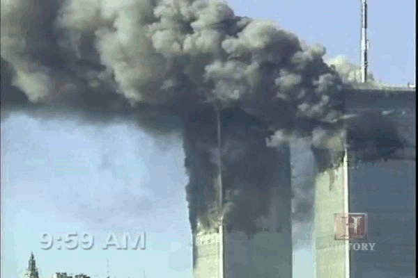 This gif consists of 4 images. the first 2 images are the same as the ones shown just before. The 2 additional images show the distinct row of 75th floor ejections emerging.