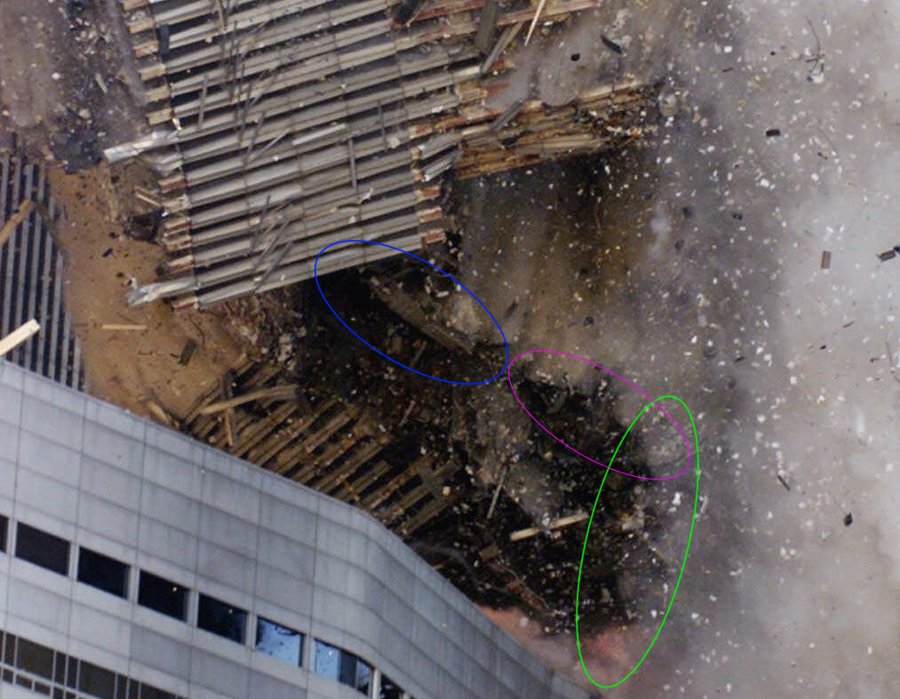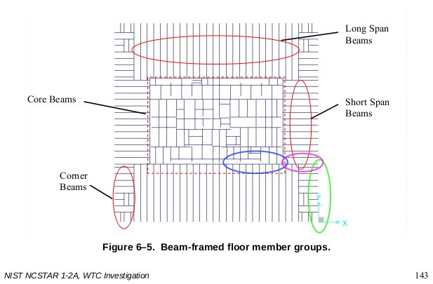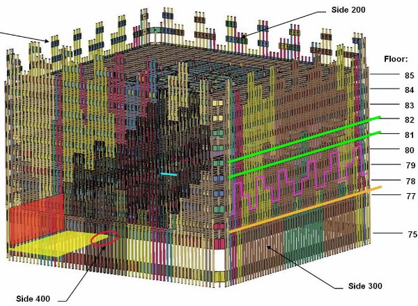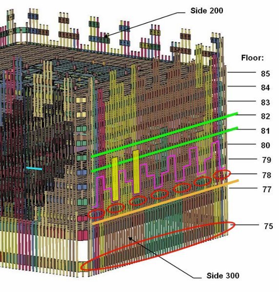 The perimeter MER panels colored in the graphic below fell along the marked trajectories. There was beam flooring from the 75th floor Mechanical equipment rooom (MER) still attached to the west face MER sheets of panels.