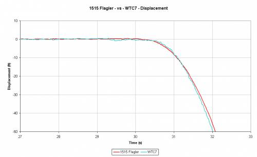 The downward displacement is shown next to the NIST measurements using the camera 3 viewpoint. As described in part 3.3, the NIST made a number of mistakes when measuring downward displacement, velocity and acceleration of a point on the building. The mistakes made are too numerous to reproduce here.