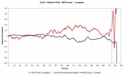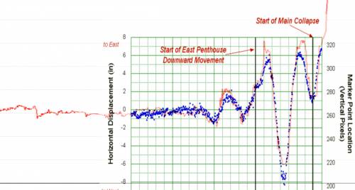 About 6 seconds before the collapse first becomes visible the northwest corner starts to rock more intensely. This movement was detected by the NIST and they consider it to be the earliest detectable motion. The first visible movement was the collapse of the east penthouse and is indicated in the graph. Once the east penthouse begins to fall, the rocking becomes even more intense until the whole penthouse starts to fall collectively about 5 seconds later.