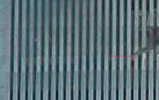 impact point, the port wing-tip penetrating the façade at the port wing-tip