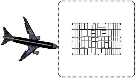 “The aircraft and exterior wall models were used to visualise the impact scenario in the figures and the view shown was aligned with the aircraft trajectory.” NCSTAR1-2 E.6
