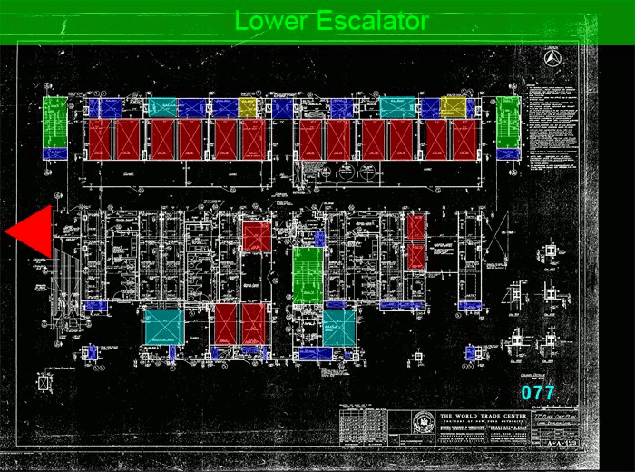 The area under the hall leading to the elevators must be dead space, since it surrounded by elevator pits on both sides. This leaves the pits themselves and the dead space between pits as concealed areas. The 77th fl weld connections are in this concealed space, about 3 to 4 ft above the floor of the pit.