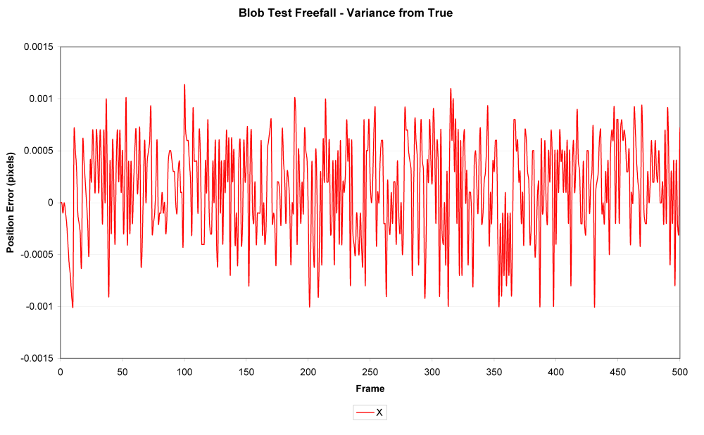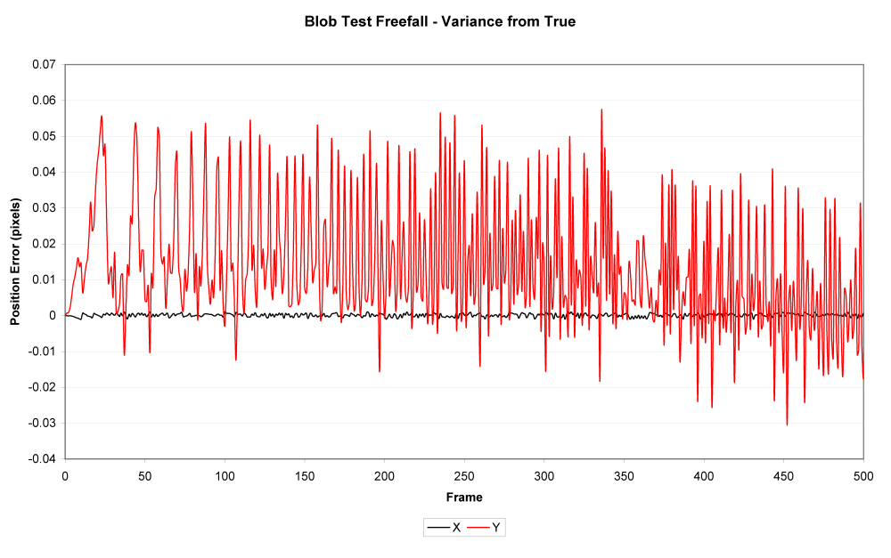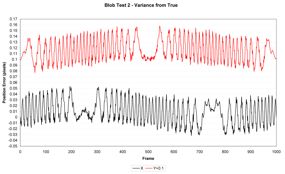 The graph shows accurate (not perfect) sub-pixel location data for the position of the small blob.