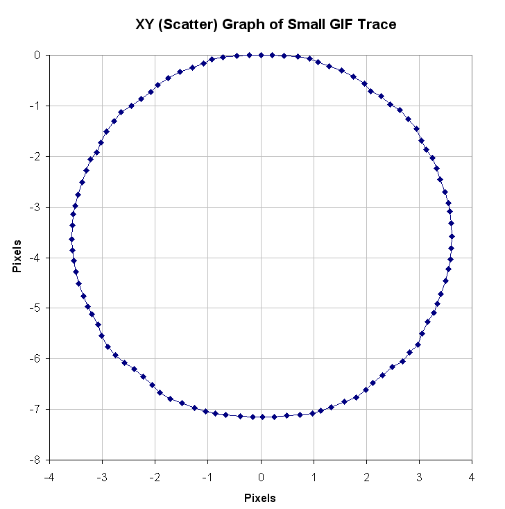 Quite interesting. Shows the error across pixel boundaries (which makes sense), and the *drift* given circular movement (which is slightly surprising, but about a third of the pixel boundary scale, so may also make sense). Also shows variation in the oscillating frequency dependant upon rotation angle (which makes sense), and flattened, non-oscillating regions at 180 degree intervals (which again makes sense).