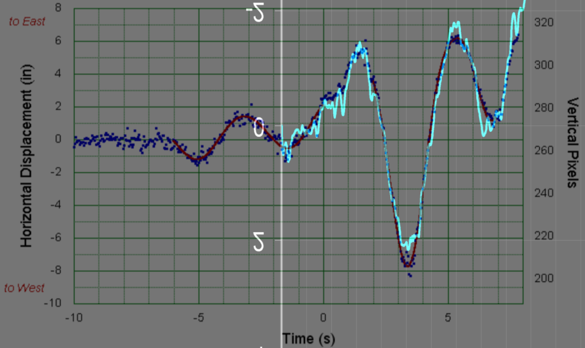 That the NIST moire method can only be used for one single point and my method can be used anywhere on the frame leads me to suggest that I'm generating the best quality positional data for the other building locations that there has been presented thus far. It is not clear at all how NIST performed their roofline positional data, but it's description suggests it was not great quality (their described initial point cannot be determined accurately, and there's no way to determine where the roofline actually is near their described location). There's then the fact that they used a point somewhere around the mid-point of the building width in the Cam#3 footage, which has the implication that they've interpreted the flexing and twisting motion as vertical movement, and ignored perspective correction. All these issues can be cleared up by using better, and public, trace data.