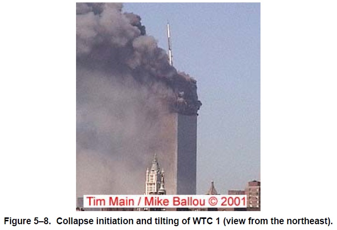 "The WTC 1 building section above the impact and fire area tilted to the south as the structural collapse initiated, as shown in Fig. E-6. A tilt to the south of at least 8 degrees occurred before dust clouds obscured the view and the building section began to fall downward."