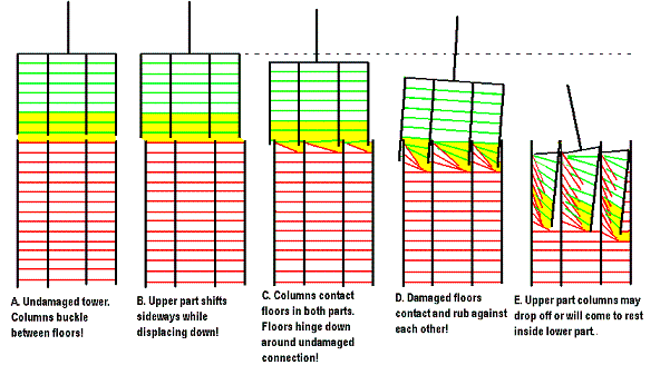 Instead of realistically asking about the interactions between the complex surfaces of building sections consisting of perimeter, core and flooring, they will simply ask how one "block" manages to be supported by the other. Descriptions of the complex interactions between perimeter and perimeter, or between flooring and flooring, or the complex behavior of core columns acting as spears are never addressed. Instead, the building is considered as one simple block resting on top of another simple block exactly as the physics 101 block systems shown earlier.