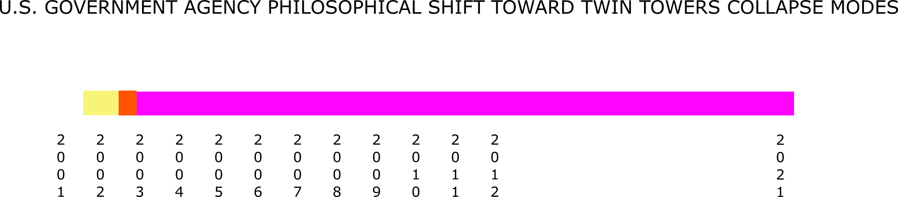 The collapses happened in 2001. The red region is when a philosophical change took place in each case. In the areas before the red region the Twin Towers collapse modes were described in only the most general and generic terms by each party.